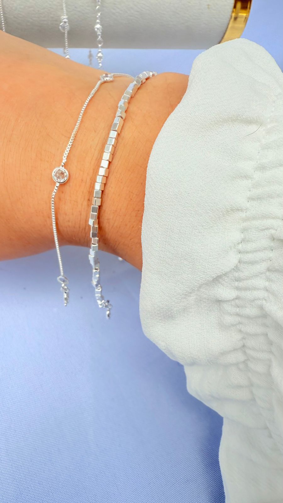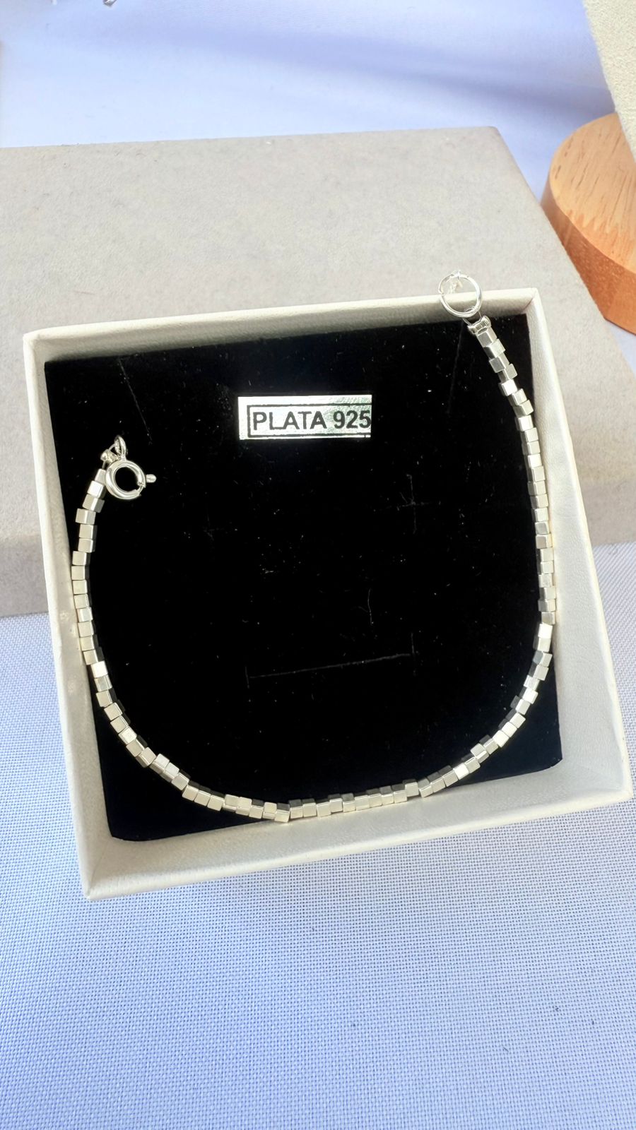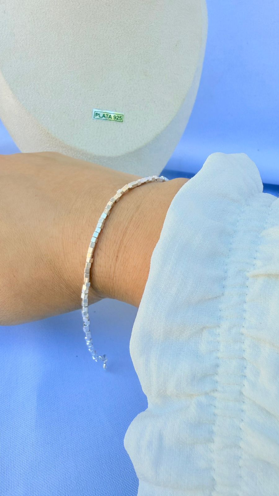 Nuestra pulsera de Plata 925 con diseño de pequeños cubos es la pieza que le faltaba a tu colección. Su estructura minimalista crea reflejos únicos con cada movimiento, dándole un brillo moderno y sofisticado a tu muñeca. 🧊✨
