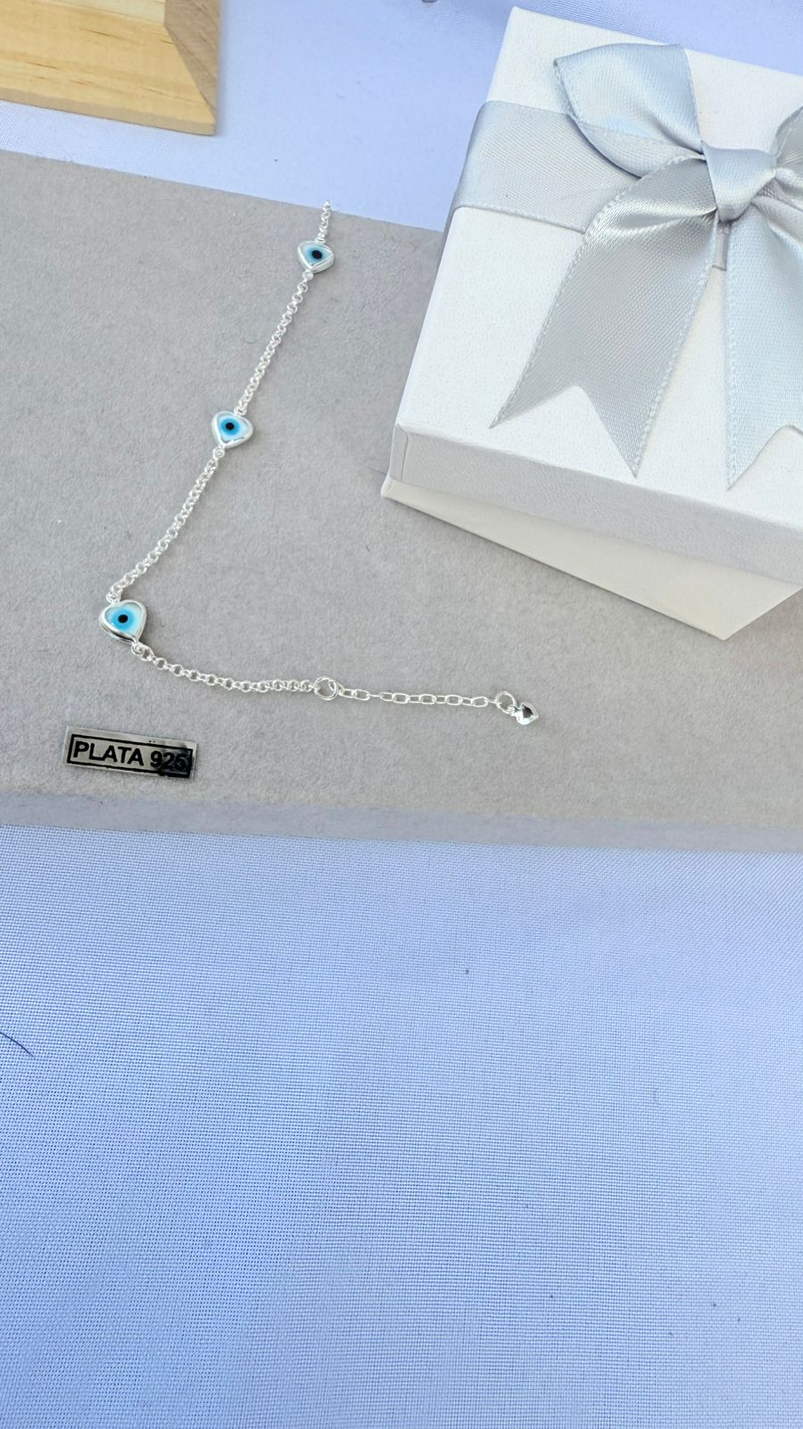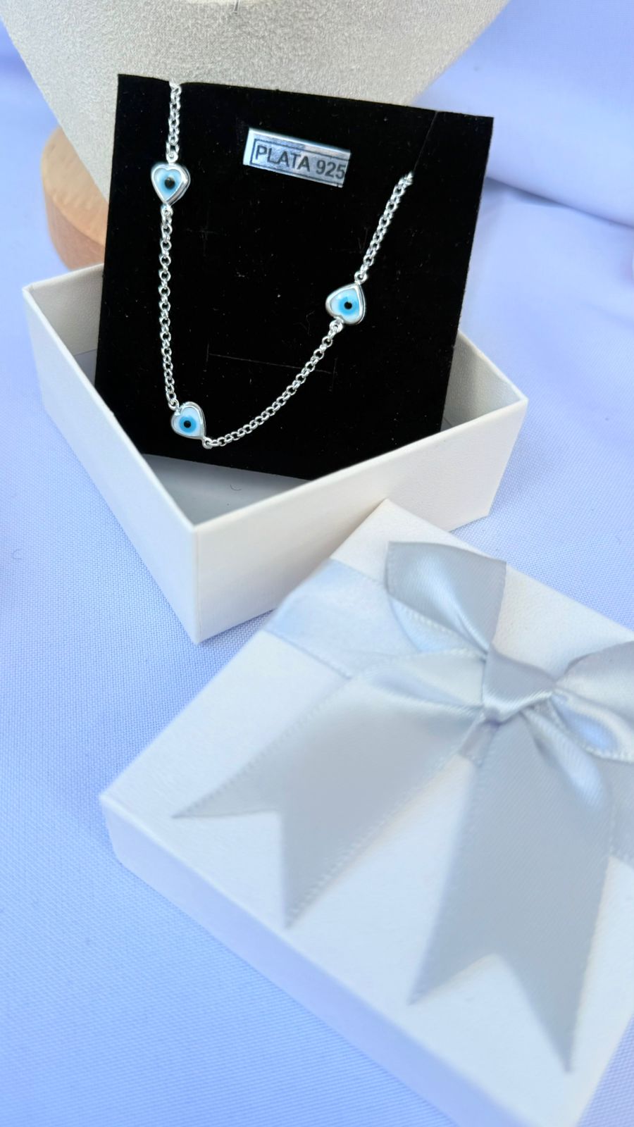 🧿 Detalles: Dijes de ojo turco azul enmarcados en delicados corazones de plata.
