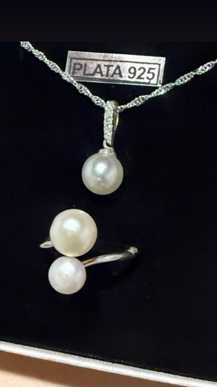 Conjunto perla anillo y cadena dije plata 925